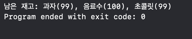 print("남은 재고: 과자(\(snackCount)), 음료수(\(drinksCount)), 초콜릿(\(chocolateCount))")