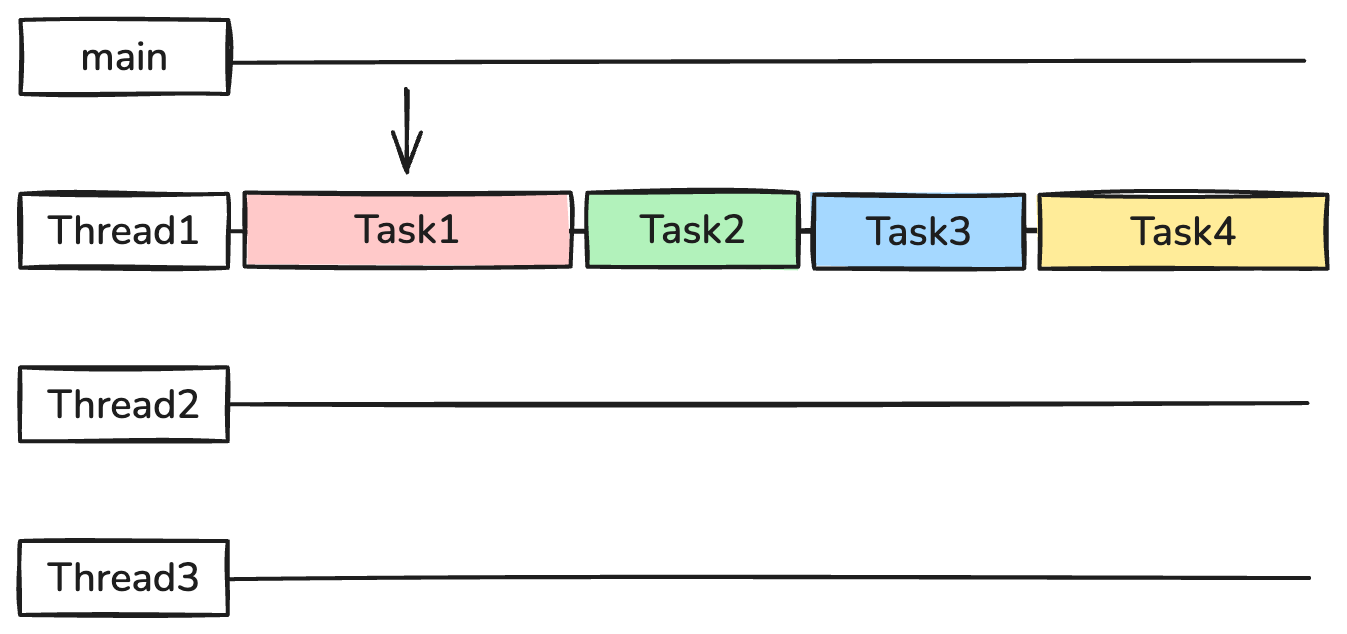 우리가 요청한 작업은 아래 그림과 같이 하나의 스레드에서 순차적으로 작업이 이뤄진다. 요청한 작업을 처리하는데 걸리는 시간이 얼마 걸리지 않는다면 순차적으로 처리해도 문제가 되지 않는다.