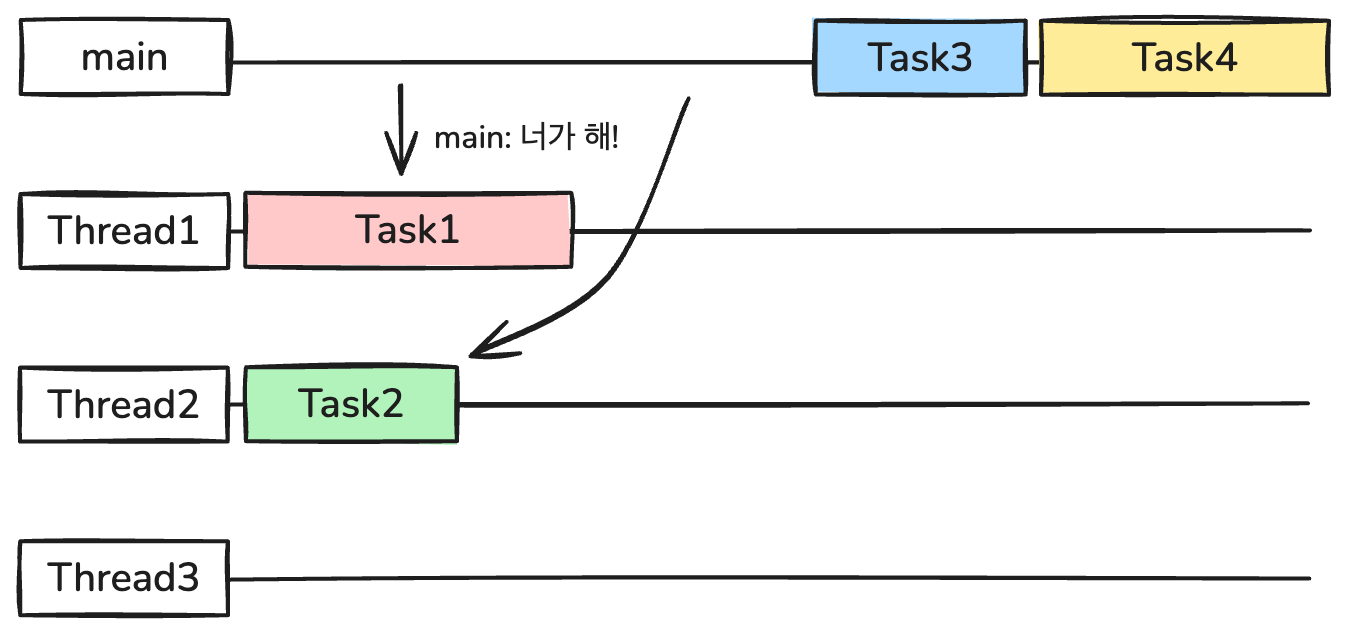 작업1을 처리하라고 요청을 하면 해당 작업이 끝날 때까지 main 스레드는 아무것도 할 수가 없다.