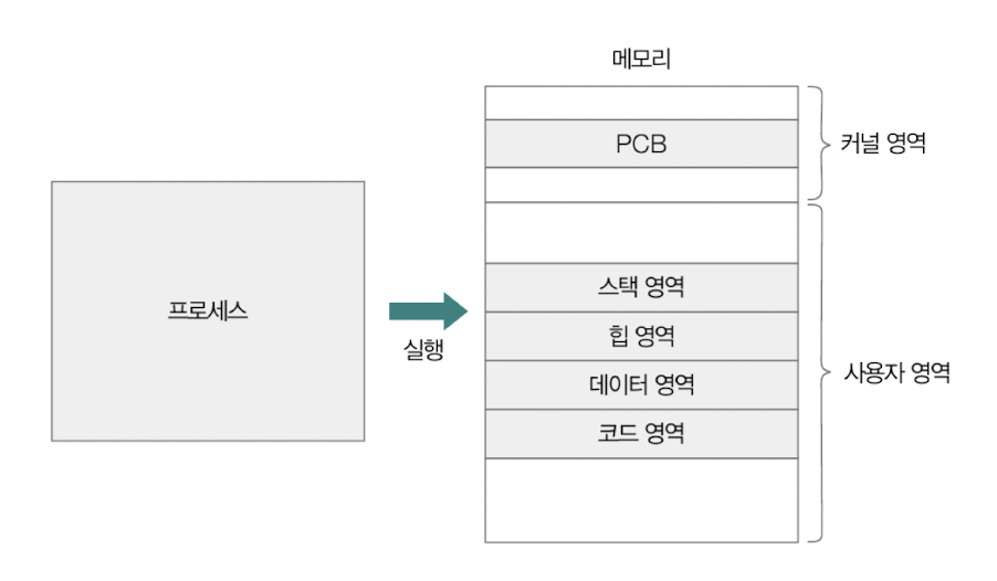 프로세스의 메모리 구조는 다음 그림과 같다. 커널 영역에는 프로세스 제어 블록 (PCB)이 저장되고, 사용자 영역에는 코드, 데이터, 힙, 스택 영역으로 나뉘어 저장된다.