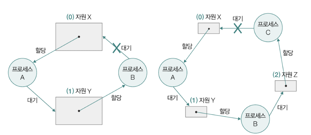 또한, 자원에 번호를 붙인 후 각 프로세스가 본인이 점유한 자원보다 큰 번호의 자원만 요구할 수 있다면 원형 대기 조건을 만족하지 않는다.
