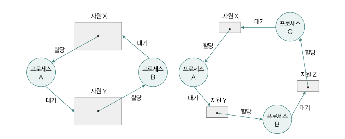 한 프로세스가 어떤 자원을 할당받은 상태(점유)에서 다른 자원을 할당받기를 기다리는 경우(대기)에 교착 상태가 발생할 수 있다.