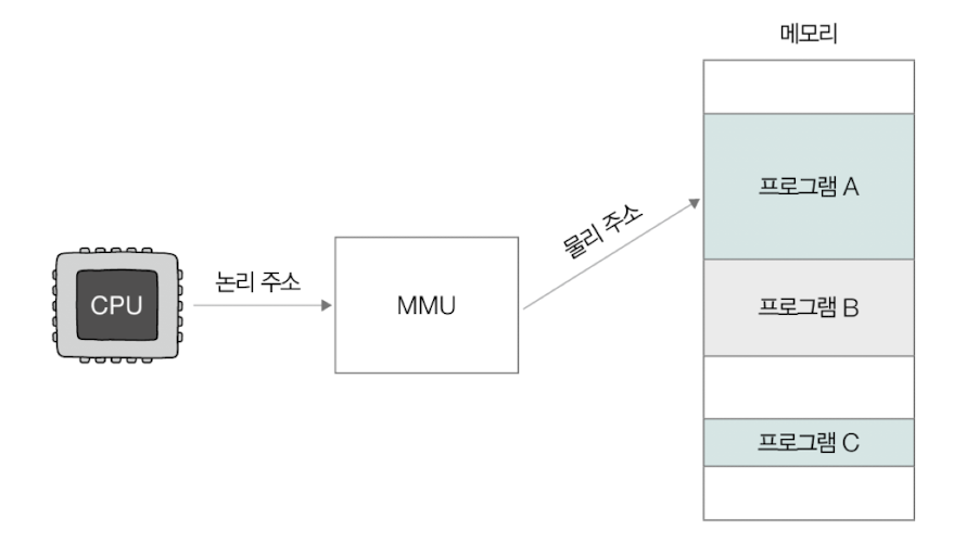 이처럼 CPU가 프로세스를 실행할 때 사용하는 주소 값과 실제 하드웨어 상의 주소 값이 다르므로 반드시 논리 주소와 물리 주소 간의 변환이 필요하다. 이때 논리 주소를 물리 주소로 변환하는 역할을 하는 것이 메모리 관리 장치(MMU, Memory Menagement Unit)이다.