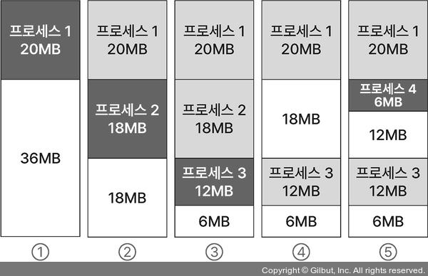 그리고 프로세스 3과 4처럼 분할된 크기보다 작은 프로세스가 할당되어 메모리 공간이 남는 경우를 내부 단편화라고 한다.