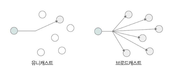 - 브로드캐스트: 네트워크 상 모든 호스트에 전송