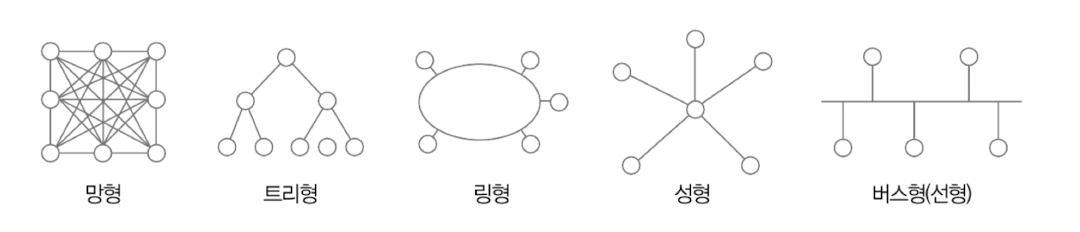 위 그림과 같이 네트워크 상에서 노드와 노드 사이의 연결 구조를 네트워크 토폴로지라고 하며, 아래 다섯 가지 유형이 있다.