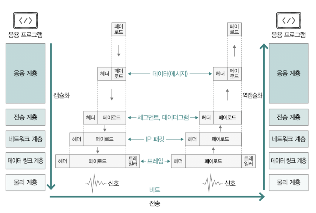 각 계층에서 헤더+페이로드로 이루어진 데이터는 다음 계층에서 페이로드가 되고, 다시 다른 헤더 또는 트레일러가 붙게 된다.