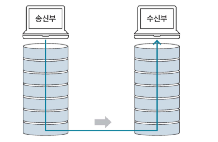 송신부는 패킷을 상위 계층에서 하위 계층으로 정보를 보내고, 수신부에서는 하위 계층에서 상위 계층으로 정보를 전달한다.