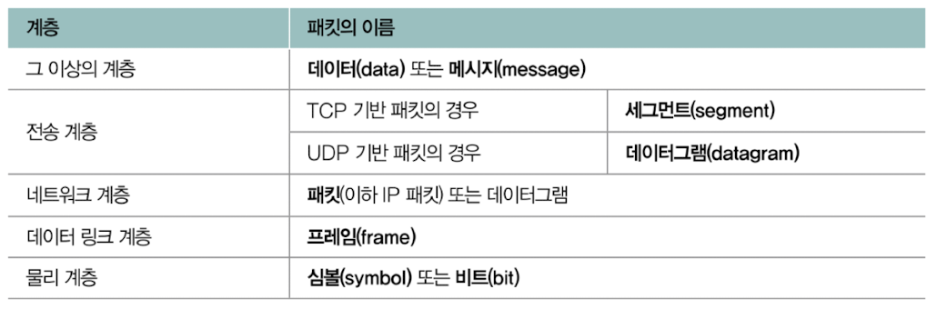 참고할 점은, 각 계층에서 주고받는 패킷은 지칭하는 이름이 다르다.