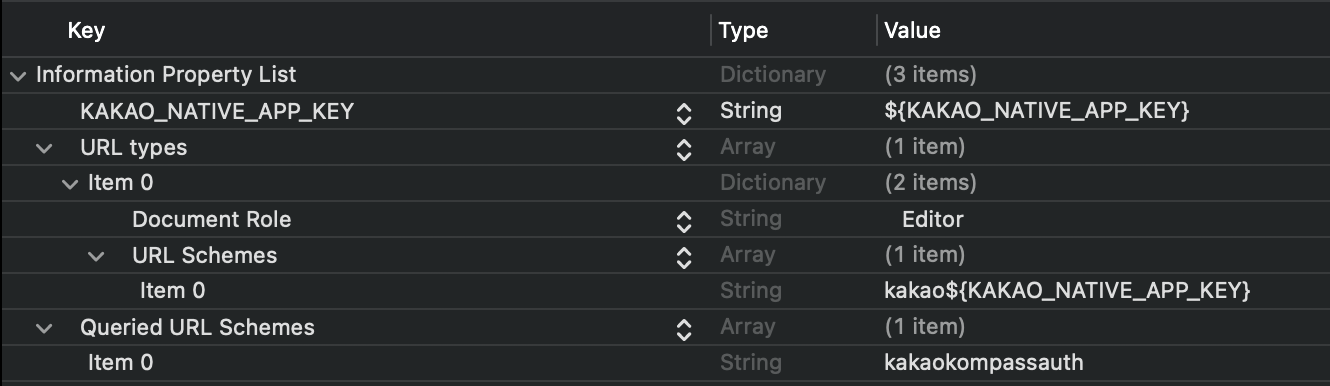 [Info] > [URL Types] > [URL Schemes] 항목에 네이티브 앱 키(Native App Key)를 kakao${NATIVE_APP_KEY} 형식으로 등록