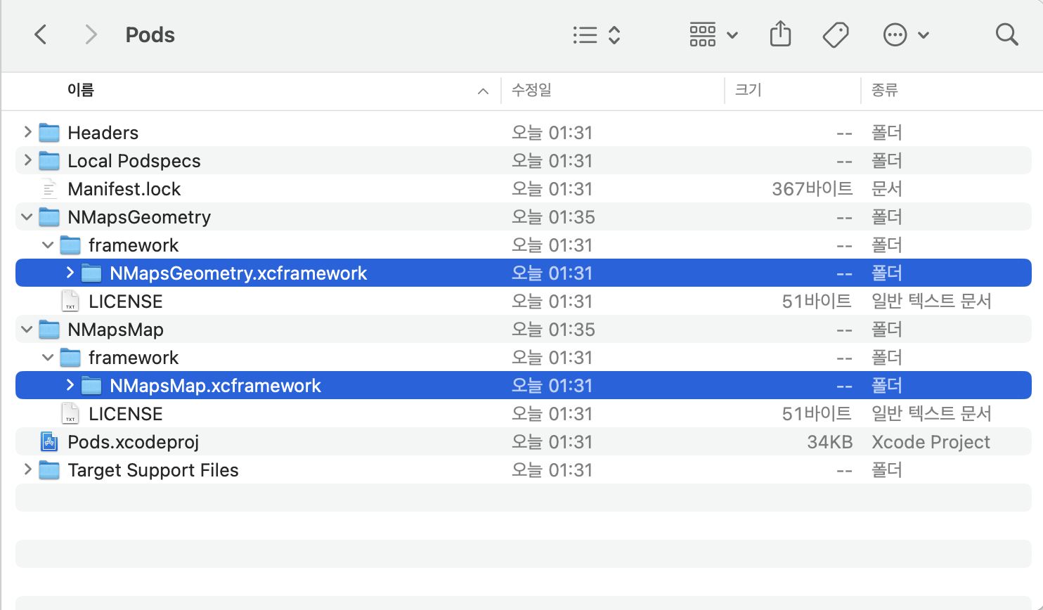 2번에서 SDK를 정상적으로 설치했다면 프로젝트에 Pods 폴더가 생성되고 그 안에 `NMapsGeoMetry`와 `NMapsMap` 폴더가 생성되어있을 것이다.